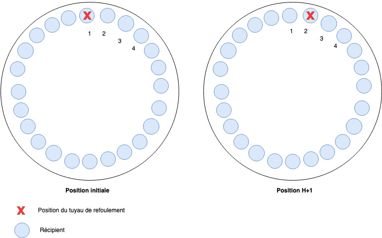Pour cela je pense placer 24 récipients sur un disque (voir schéma) et déplacer le tuyau de refoulement de ma pompe de récipient en récipient. Pour réaliser ce mouvement je pense utiliser un disque de même diamètre que celui des récipients, que je placerais au dessus du premier disque, sur le même axe central. En perçant le deuxième disque d'un trou a la même distance du centre que les récipients, je pourrais faire passer mon tuyau de refoulement et cela devrait permettre de refouler dans le contenant situé dessous, puis par une rotation de quelques degrés refouler dans le second, et ainsi de suite.