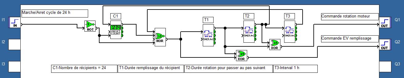Je suis en train de travailler sur un préleveur d'échantillon liquide automatique afin de surveiller la qualité de l'eau d'une rivière au cours du temps. Le préleveur se compose d'une pompe qui préleve toutes les heures de l'eau (100ml) grâce à un tuyau plongé dans la rivière. Ce préleveur reste au bord de la rivière 24h puis l'eau prélevée est analysée. Le préleveur est piloté par un zelio (choisi pour sa robustesse et simplicité) et est sûr une batterie 12v