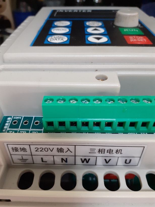 Je poste une photo de la façade et une photo du bornier. Il me semble avoir vu que pour du monophasé, mon application, celui-ci n'est peut-être pas le bon. Le monophasé présente un trait de séparation en dessus et entre le V et le U sur l'étiquette du bornier.