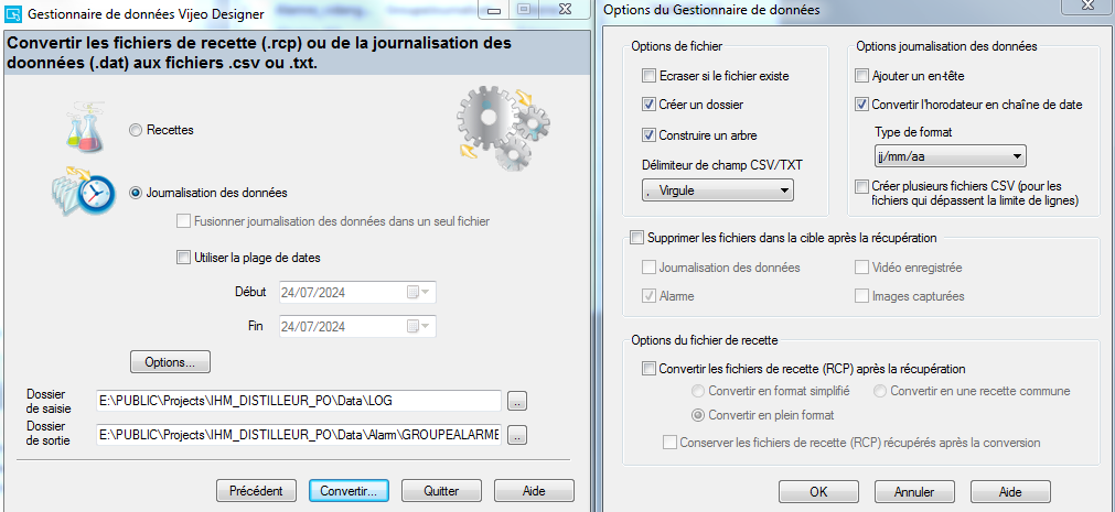 J'ai essayé de supprimer les données via des scripts ça n'a rien donnée, après je suis novice dans tout ce qui est automatisme je n'ai surement pas la bonne méthode pour faire via script, mais j'ai aussi essayé via un bouton et la fonction "copier les données vers le lecteur" et cocher "Supprimer les fichiers de données après la copie (sauf recettes)", mais bon je n'arrive même pas à récupérer les alarmes via ce bouton. Encore une fois, je m'y prends sûrement mal .