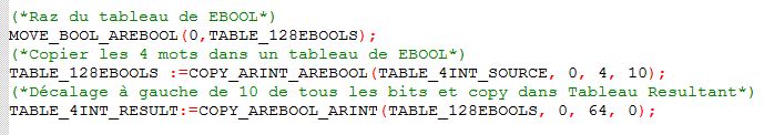 J’ai pas trouvé de fonction pour faire un décalage logique de 10 bits à droite de tous les bits d’un tableau de 4 mots, je me la suis paluché à la mano, pour info exemple ci dessous.